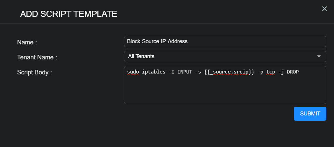 Enter the Name. Each script must have a unique name. This field does not support multibyte characters or spaces. You cannot edit the name after you submit. We entered Block-Source-IP-Address.