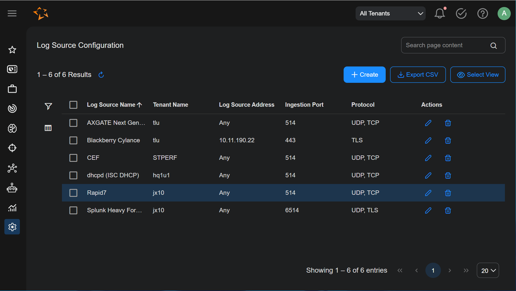 • The Log Source page supports standard Stellar Cyber table functionality, including edit and delete capabilities.