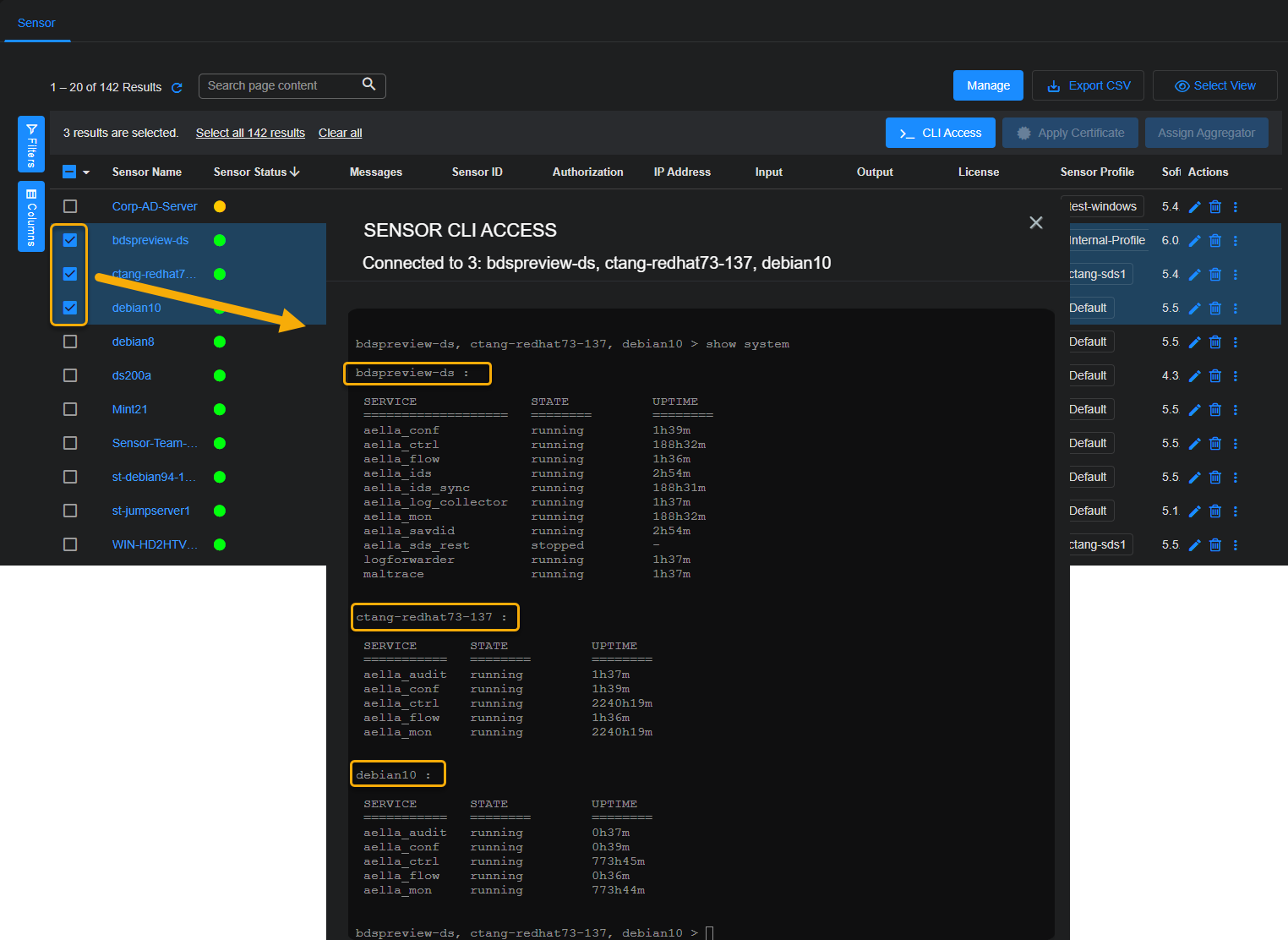 - List the known sensors with basic information such as host name, sensor ID, IP address, and software version