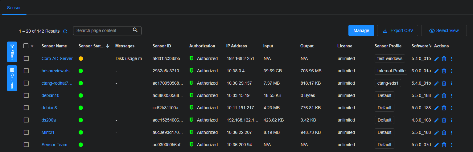 The System | DATA SOURCE MANAGEMENT | Sensors | Sensors page provides a list of all known sensors that are connected to the Stellar Cyber Platform.