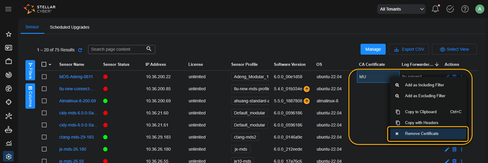 Note that if you change a sensor's tenant assignment, any CA certificates assigned to the sensor are automatically cleared without any notification in the user interface.