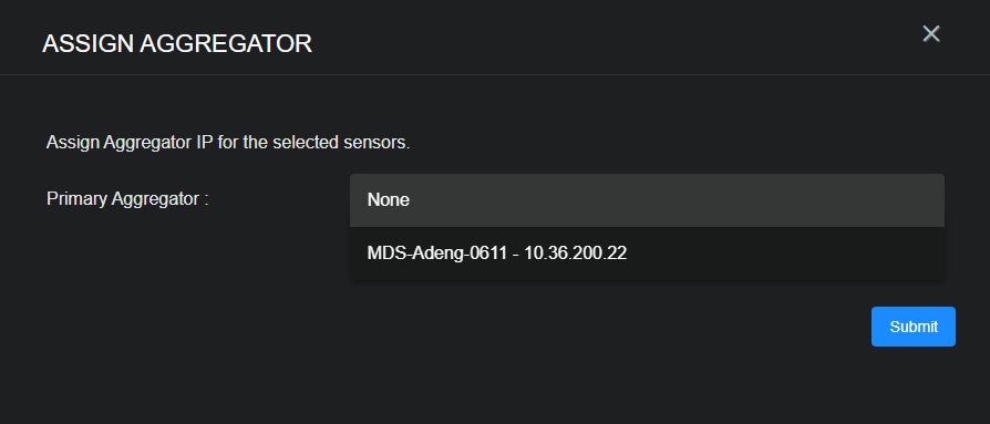 You can also assign aggregators from directly within the Sensor Overview. Start by checking the box for the sensor to which you want to assign an aggregator. Then, click the Assign Aggregator button that appears at the top of the table to open a dialog box where you can assign both a primary and secondary aggregator. See Assigning Aggregators to Sensors for details.