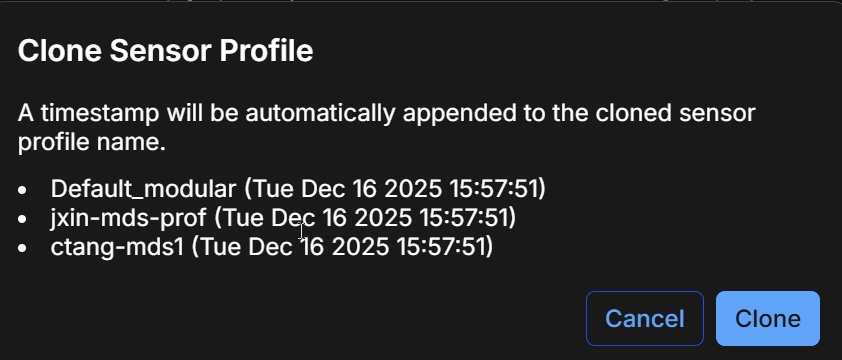 Keep in mind that Sensor Profile names cannot be changed once the profile is created. Because of this, if you want to customize the names of your cloned sensor profiles, make sure to clone them one at a time rather than using the bulk clone feature.