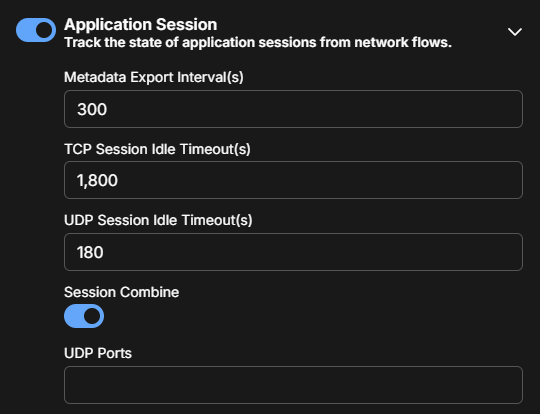 Enable this option for the sensor to identify the length of individual network sessions. The parameters specify how often to report the session information and what timeout to apply when determining that a session has ended.