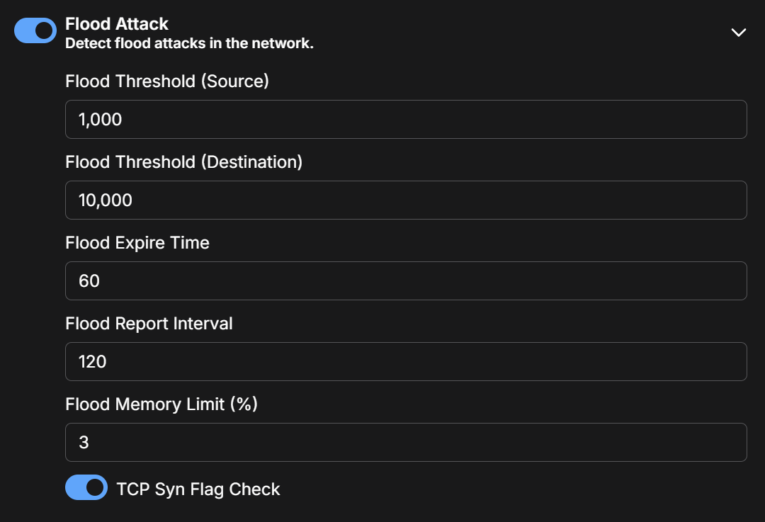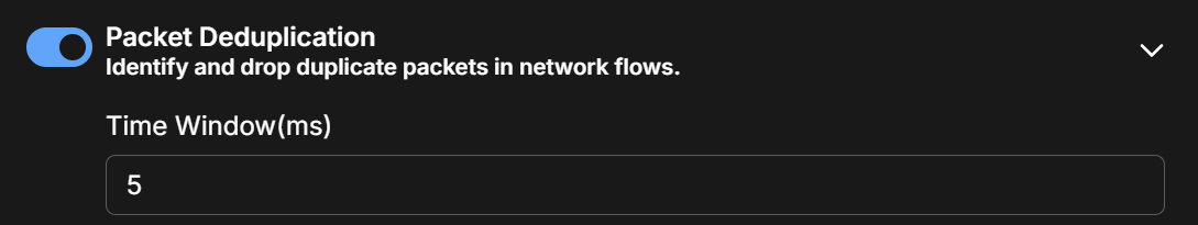 Enable this for the sensor to perform packet deduplication. This reduces storage by removing duplicate data. However, it uses processing power on the sensor to analyze the data, and can significantly slow system performance. When you enable it, you can set the deduplication time window.