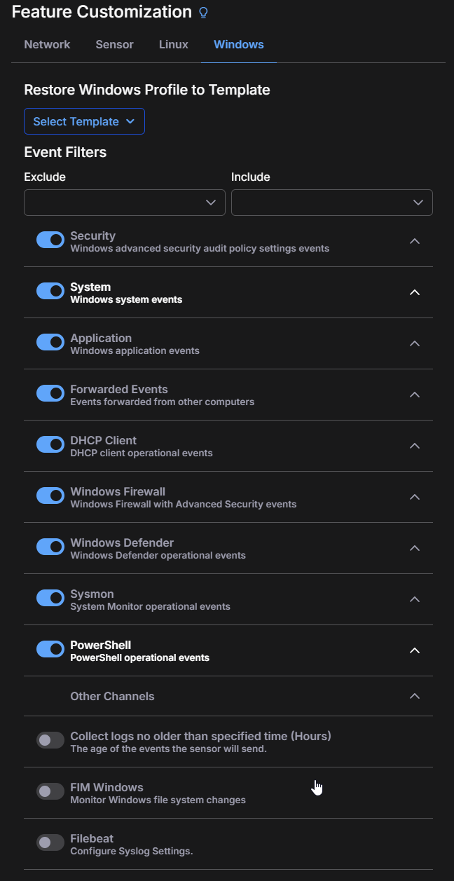 If you disable all Windows event log channels in the sensor profile, the sensor's Winlogbeat service (aella_winlog) is automatically disabled, preventing unnecessary service execution. File Integrity Monitoring is unaffected and can still be run without enabling Winlogbeat.