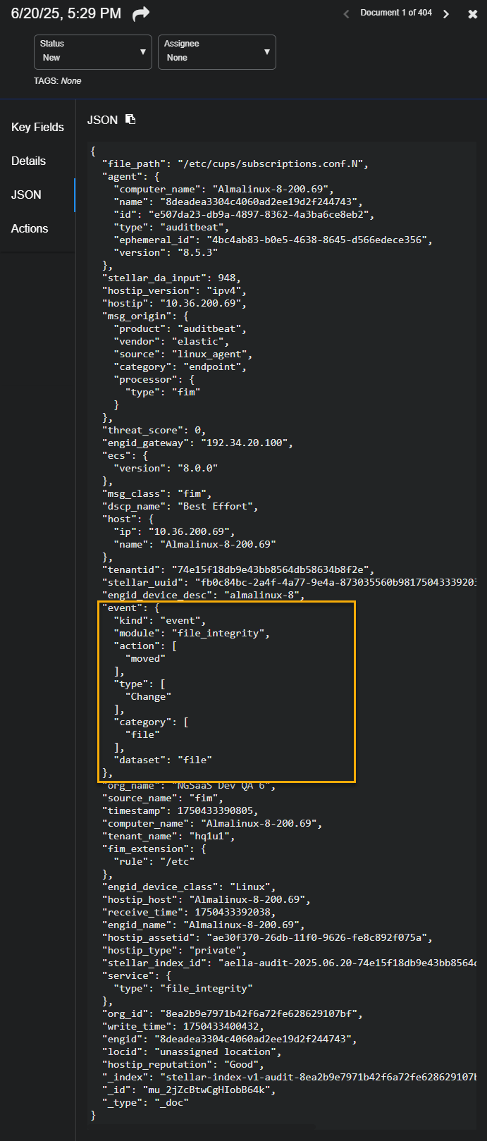 The JSON for a FIM event indicates the type of change that took place. If the event indicates either a change or a deletion, the JSON includes both old and current values.  If the event indicates a file creation, only the current section appears in the JSON. For example, the JSON below shows a file creation event.