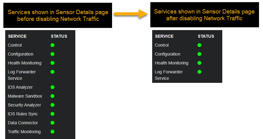 You can see the differences in the system processes running on a sensor before and after disabling Network Traffic in a sensor's Sensor Details page, as shown in the illustration below: