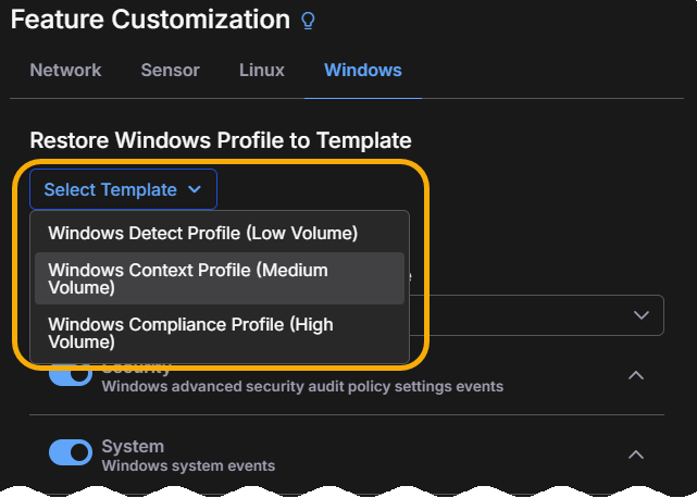 Separate templates let you apply Low, Medium, and High volume settings for Windows Server Sensors, depending on your deployment needs. Refer to Windows Server Sensor Customizations for details on the available settings.