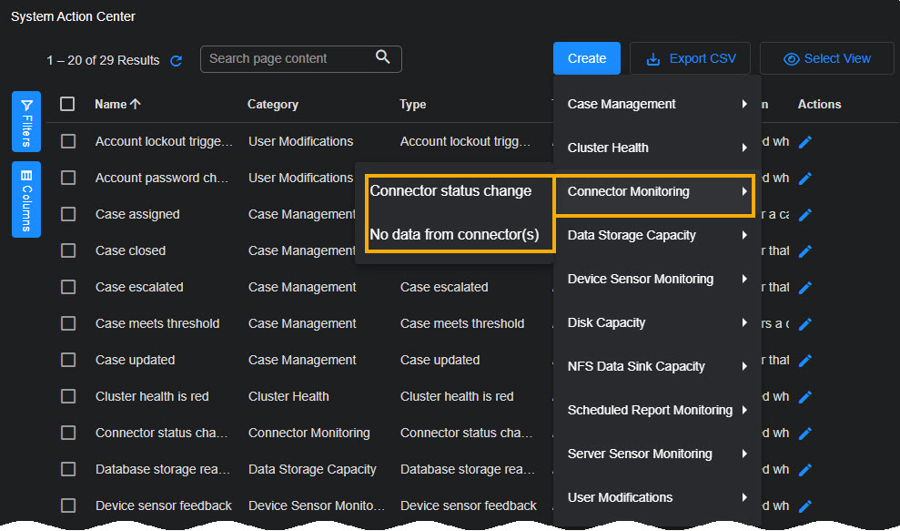 Click the Create button at the top of the System Action Center and select Scheduled Report Monitoring | Scheduled report failed from the dropdown that appears.