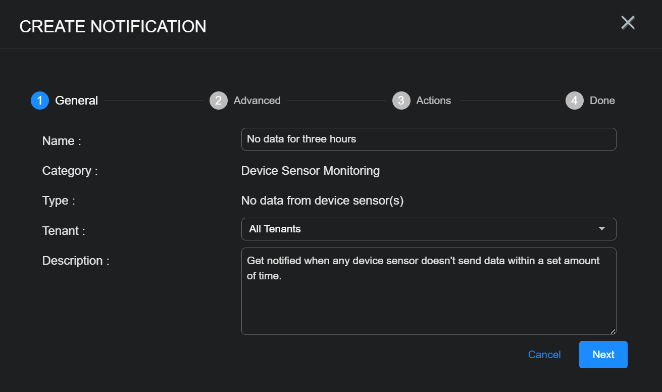| Device Sensor Monitoring | No data from device sensor(s) | Get notified when any device sensor doesn't send data within a set amount of time. | Disabled |