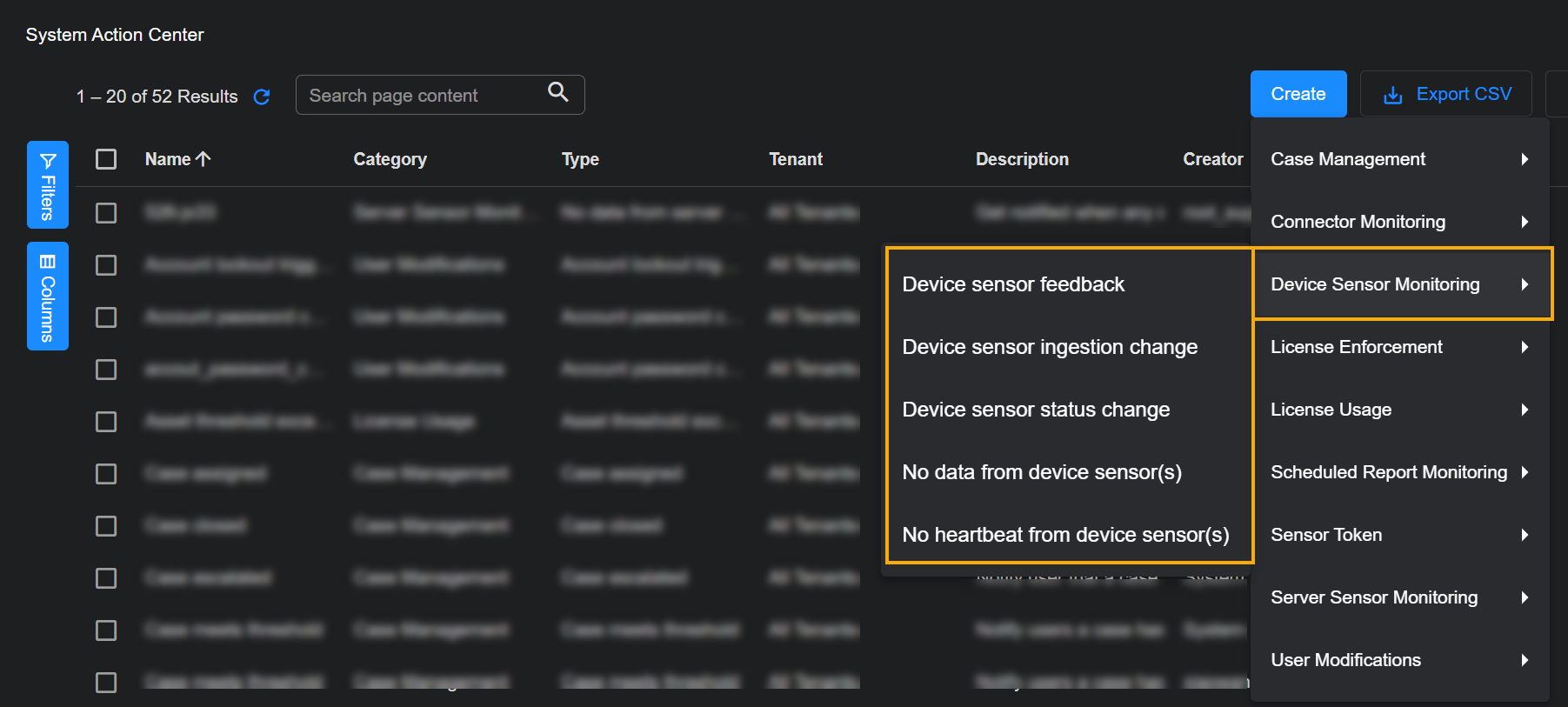 Click the Create button at the top of the System Action Center and select Server Sensor Monitoring from the dropdown that appears.