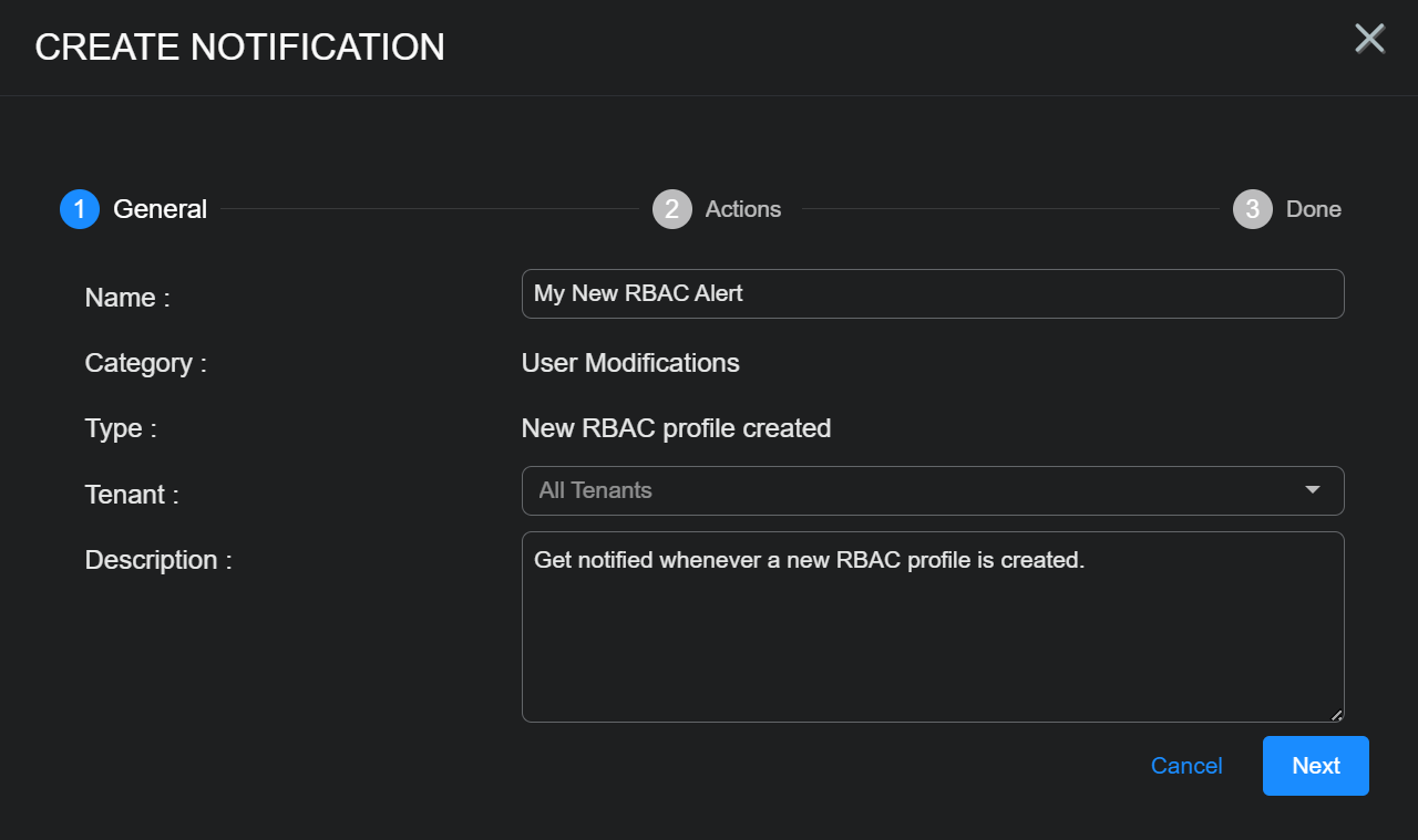 | User Modifications | New RBAC profile created | Get notified whenever a new RBAC profile is created. | Disabled |