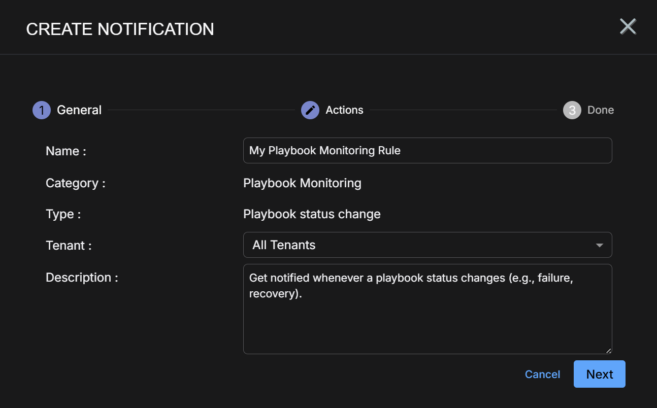 The Create Notification wizard starts with the Category set to Playbook Monitoring and the Type set to Playbook Status Change.