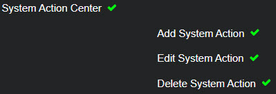 The System Action Center is only available to accounts with both Root scope and the System | System Action Center privilege assigned to their profile in System | ORGANIZATION MANAGEMENT | Role-Based Access Control. By default, this includes only the Super Admin role. The necessary privileges in the Role-Based Access Control page are shown below: