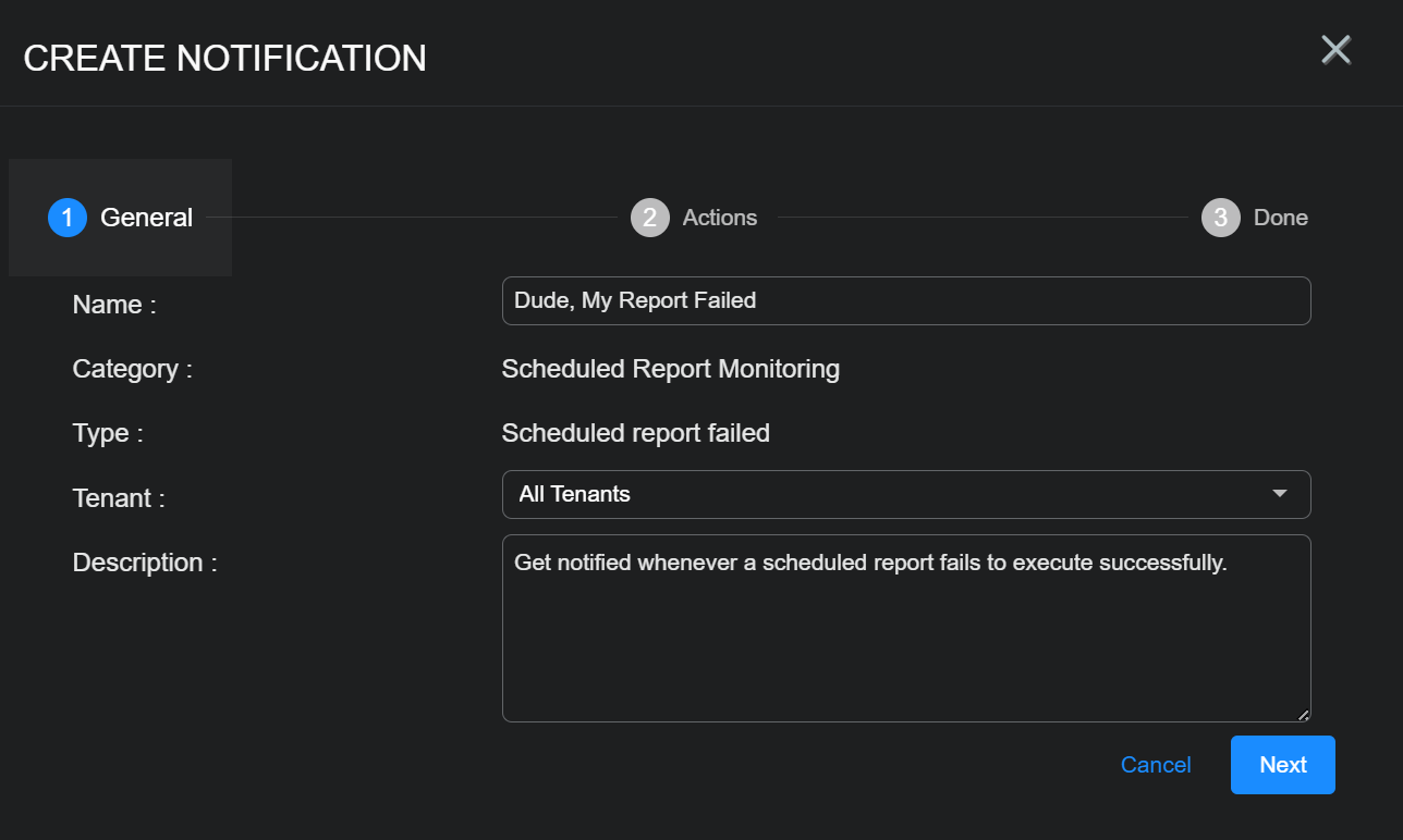 Scheduled Report Monitoring rules can notify you when a scheduled report has failed, helping you investigate report generation issues in real time. Scheduled Report Monitoring rules check for failed reports every five minutes.
