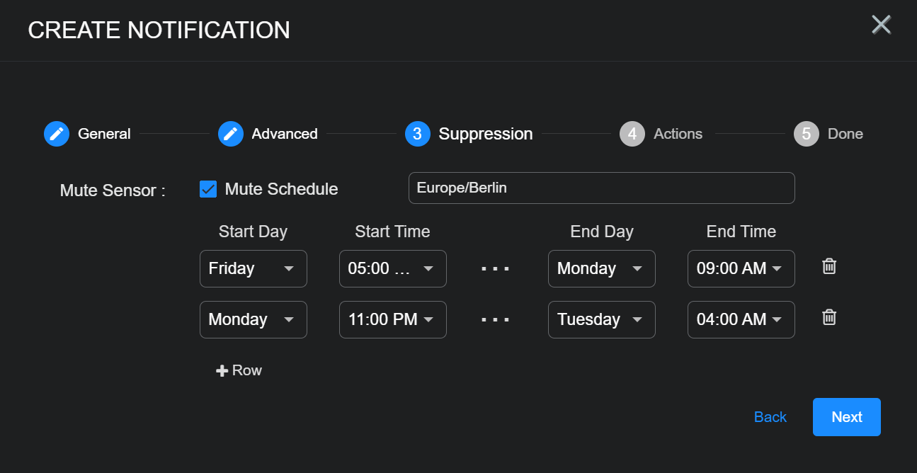 Use the Suppression step to set up a schedule of times during which notifications from the rule will not be displayed in the Notification Center or sent to configured recipients. This can be handy for suppressing notifications from sensors that you know are normally not seeing any data during specific hours.