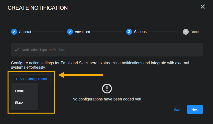 You must also configure a Publicly Accessible Authority in order to be able to configure Slack actions. The Create Notification wizard will not let you configure a Slack action until you do so.