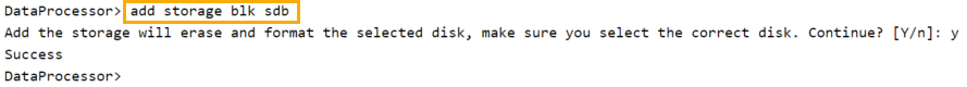 Use the add storage blk <disk_name> command to add the secondary disk, followed by Y to confirm. For example: