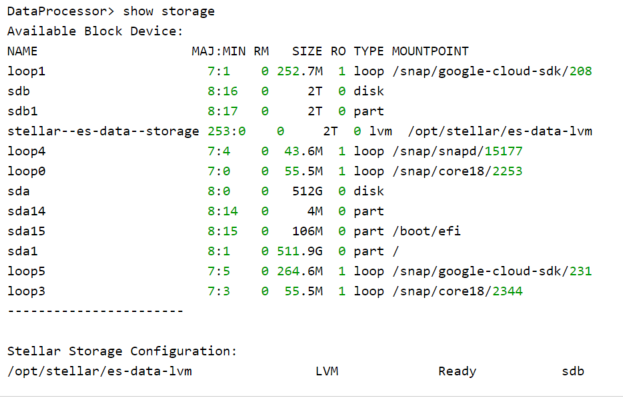 Take note of the name assigned to the new storage (es-data-lvm in this example). You will need it when migrating data to this disk in the GUI in Configuring the DL-m and DA-m in Stellar Cyber.