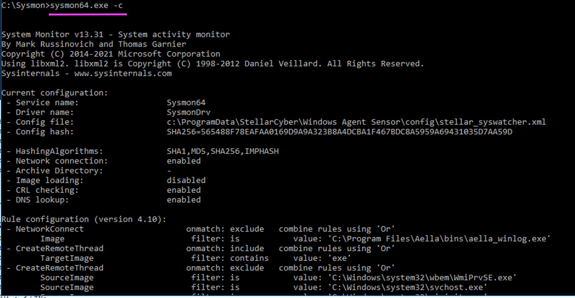 Sysmon64.exe -accepteula -i "c:\ProgramData\StellarCyber\Windows Agent Sensor\config\stellar_syswatcher.xml"