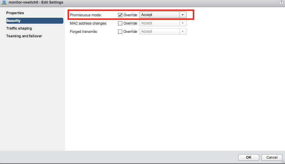 Select the "Security" panel option and enable Promiscuous Mode by selecting the appropriate Override and Accept controls as shown in the following image.