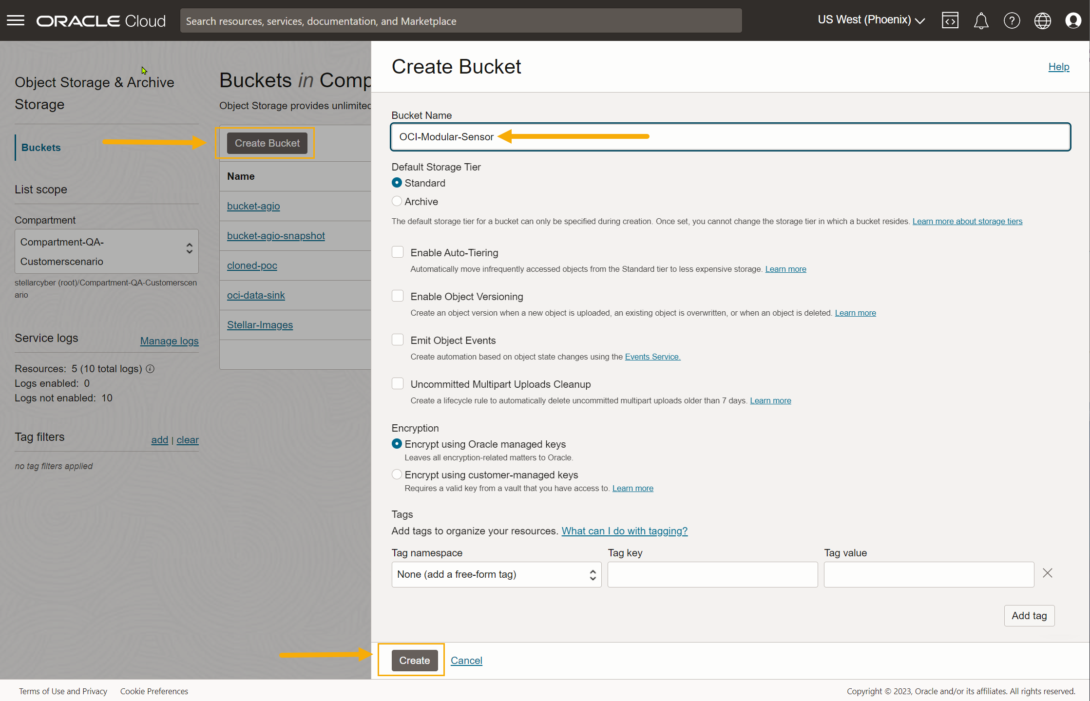 Click Create Bucket to add a new bucket. Select the Standard storage tier, supply a name, and click Create to add the bucket to your account.