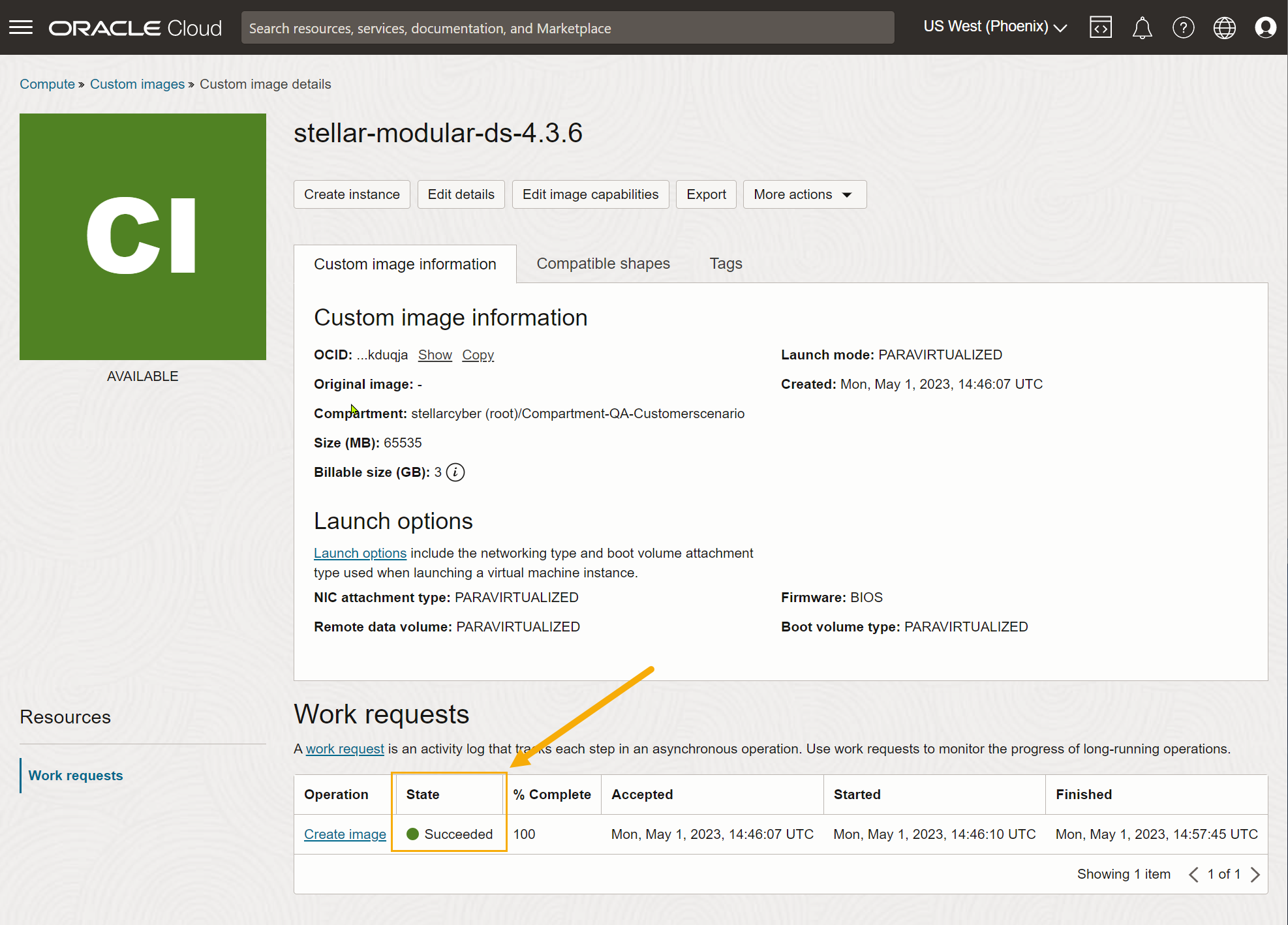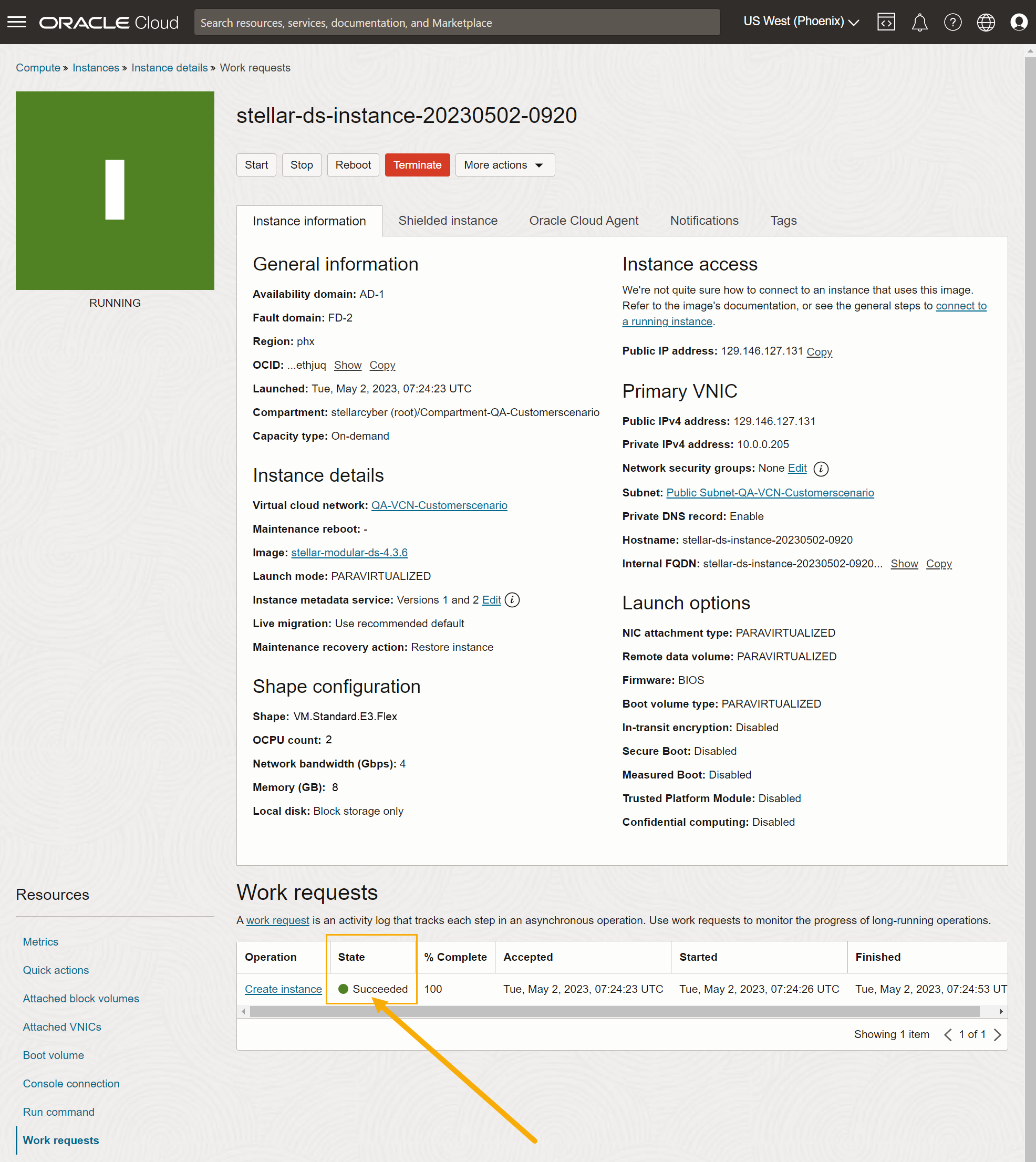 OCI begins to create the instance, tracking its progress in the Instance details | Work requests display. Once the State shown in the Work requests table shows Succeeded, as illustrated in the example below, you are ready to add a second VNIC to be used as a monitoring interface. See below.