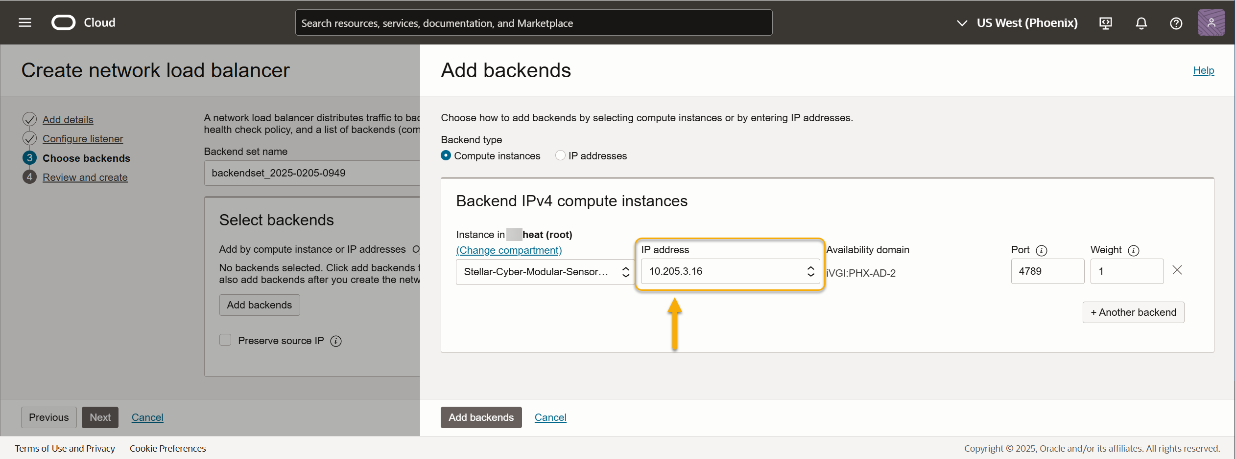 Use the Compartment and IP address fields to select the management interface of the modular sensor that we recorded during the installation of the sensor in the previous sections. In this example, we're selecting the IP address of the Modular Sensor's management interface shown in the illustration at the start of the section (10.205.3.16).