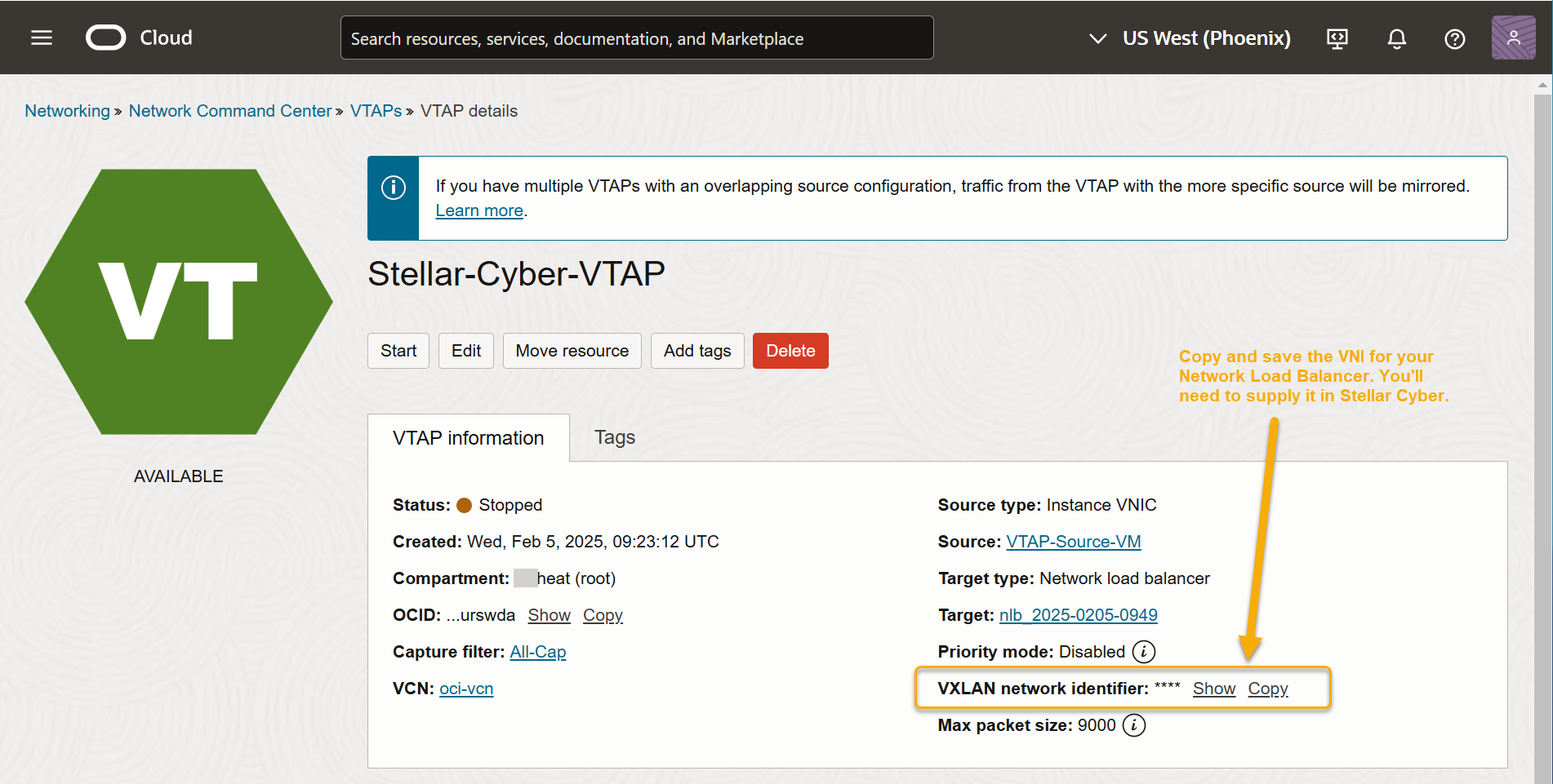 Set VNI to the VXLAN ID for your VTAP in OCI. You copied this from the VTAP's summary screen in OCI in the previous section.