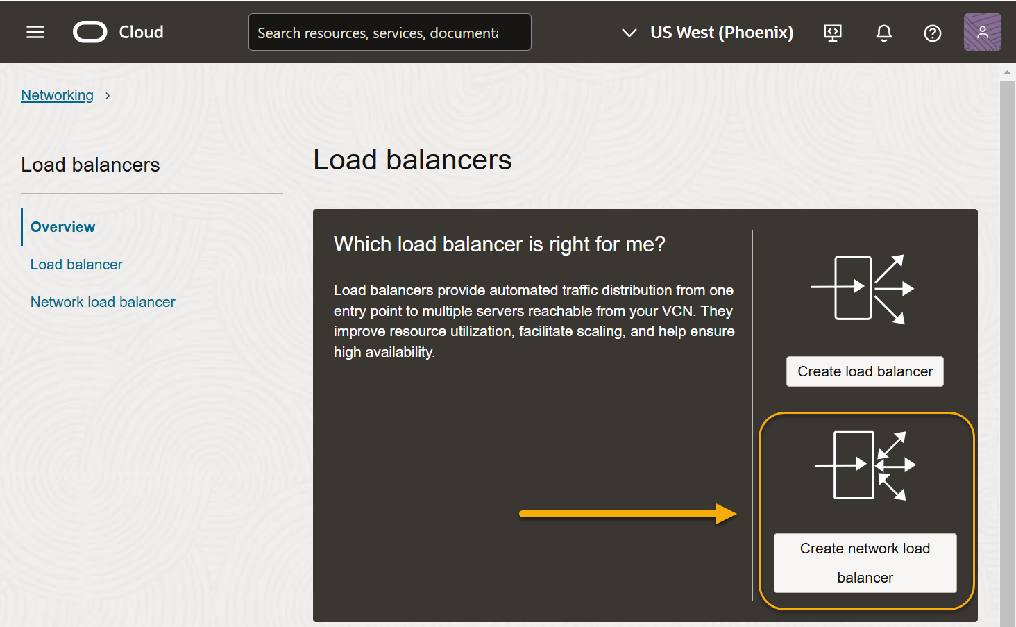 Click the Load balancers entry in the Networking menu at the left of the page. Then, click the Create network load balancer button to add a new network load balancer.