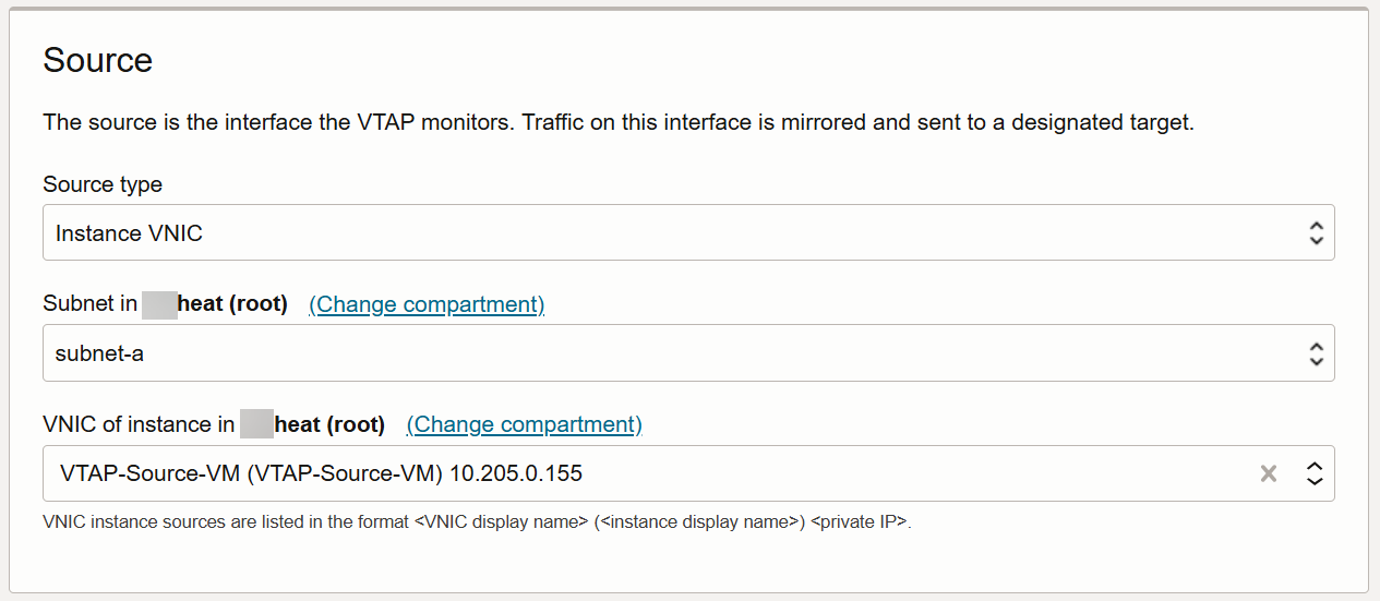Use the Source fields to select the traffic the VTAP monitors. In this example, we're tapping the traffic on a specific instance's VNIC in subnet-a: