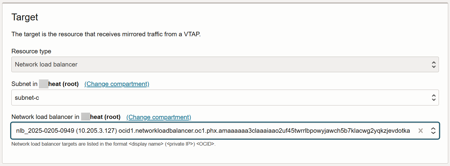 Use the Target fields to select where traffic monitored by the VTAP should be mirrored. The destination is the Network load balancer we created in the previous section. Here's how the Target fields look for our example: