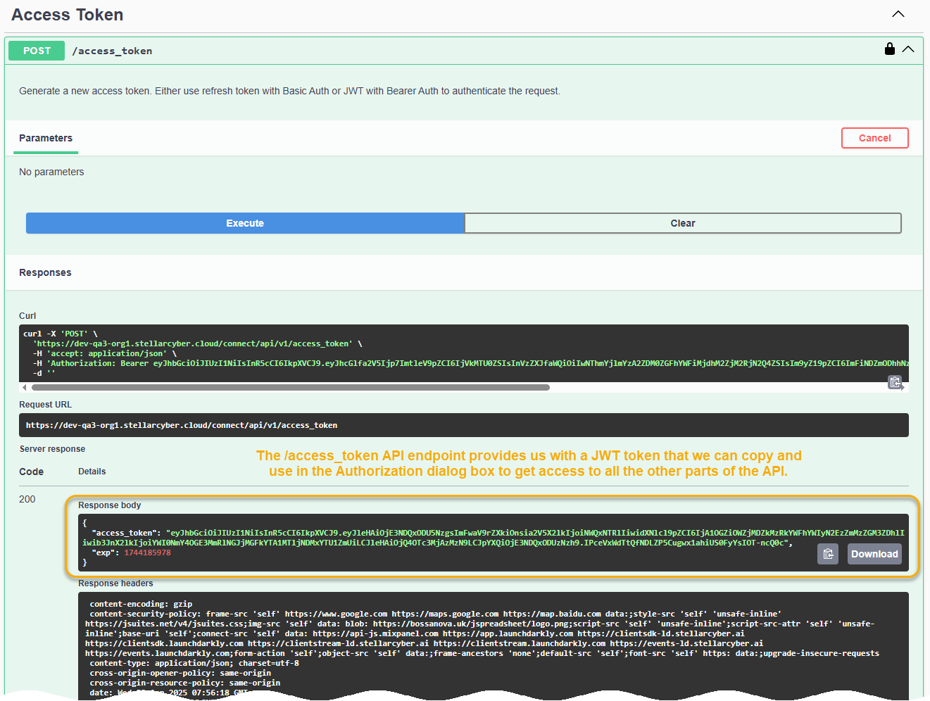 /access_tokenAPI endpoint provides us with a JWT access token, as illustrated below.The JWT access token is the green portion of the Response body between the quotation marks. Select and copy the JWT token to the clipboard, as illustrated below.