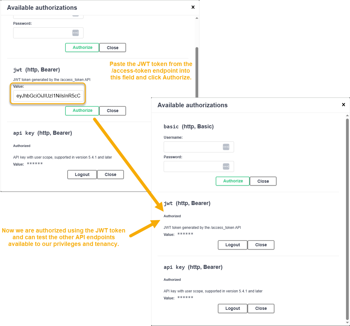 Paste the token you copied from the Response body pane into the jwt (http, Bearer) field and click Authorize, as illustrated below.