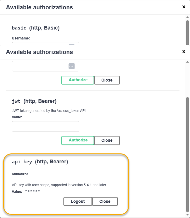 Keep in mind that JWT tokens are configured by default to expire ten minutes after they are generated. If this happens while you are using the API Test Page, you may notice that your test calls are no longer working. You can fix this by generating a new JWT token from the /access_token endpoint using the steps in the procedure above. Then, click Authorize, log out of the jwt (http, Bearer) section and log back in with your new JWT token.