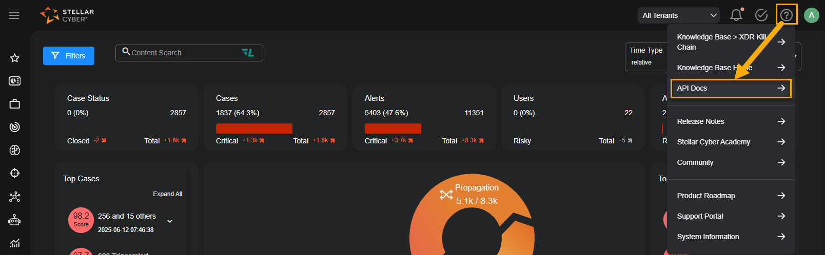 You can create and test sample API calls on your Stellar Cyber Platform by clicking the ? | API Docs option, as shown below:
