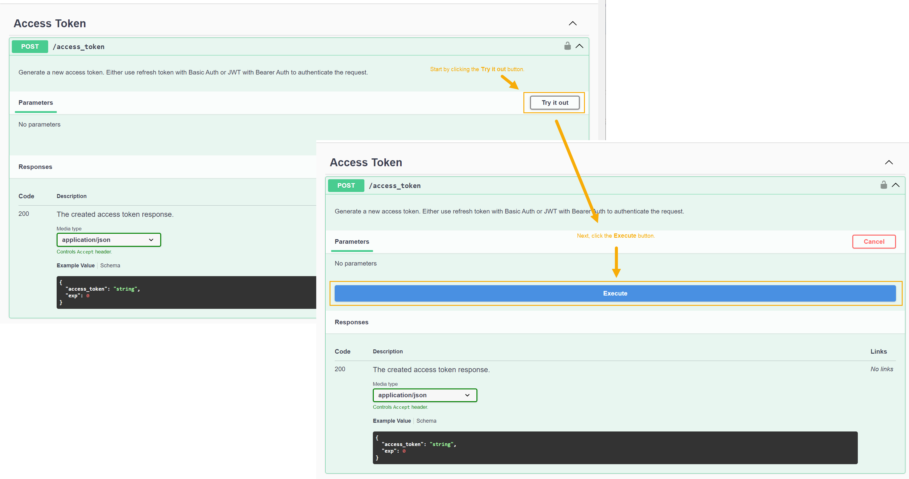 Cascade open the Access Token entry in the API Test Page. Then, click Try it out and Execute, as illustrated below:
