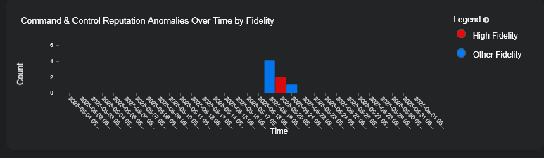 The Over Time by Fidelity graph breaks out the number of alerts triggered for the selected type by time according to their fidelity category.