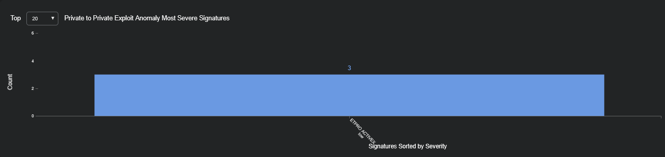 The Most Severe Signatures graph is displayed for Private to Private Exploit Anomaly and other Exploit Anomaly alert types.