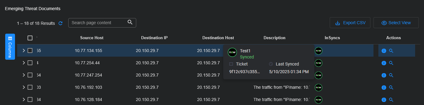 If there are any integration syncs, the table has an InSyncs column showing the alerts that have been synced. When you hover over a ServiceNow icon in the InSyncs column, the status, Ticket ID, and Last Synced date and time are displayed for each alert.