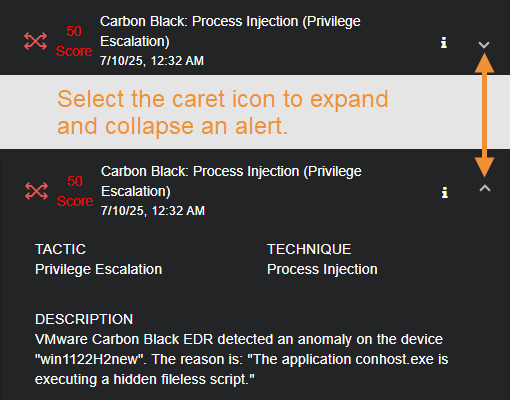 Alerts are displayed in the Timeline in individual panels. Panels appear initially as collapsed summaries, but can be toggled open by selecting the ˅ button at the right of an alert entry, as illustrated below: