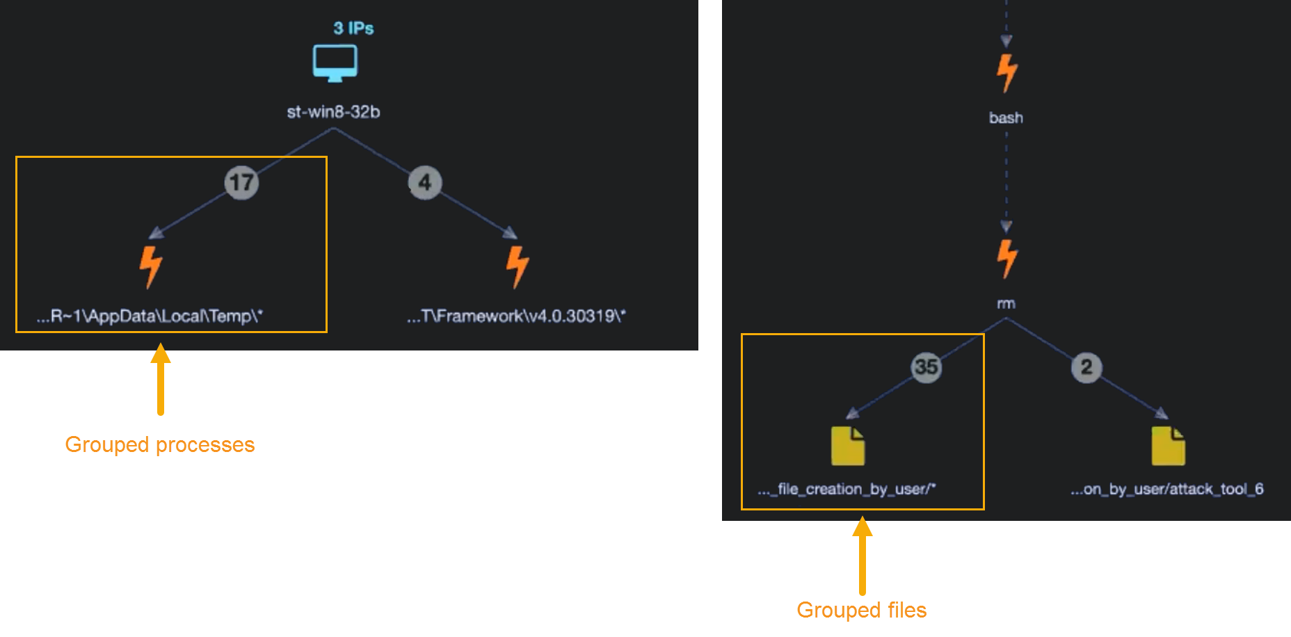 Stellar Cyber performs similar grouping for processes, files, and URLs in the Analysis tab. In situations where there are multiple files, processes, or URLs with the same alert type connecting to the same node, Stellar Cyber may display them in a summarized container to improve readability. You can always select the entry below the grouped entities to access the Group Details menu and view the constituent members, complete with drill-down access for each. The figure below shows examples of grouped processes and files in the Analyze workspace: