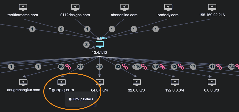 The same grouping occurs for a high volume of alerts to hosts with IP addresses that can be effectively represented as an IP address range. This differs from the grouping of multiple IPs on a single host. In this case, the group is multiple, related IP addresses or domains on different hosts.