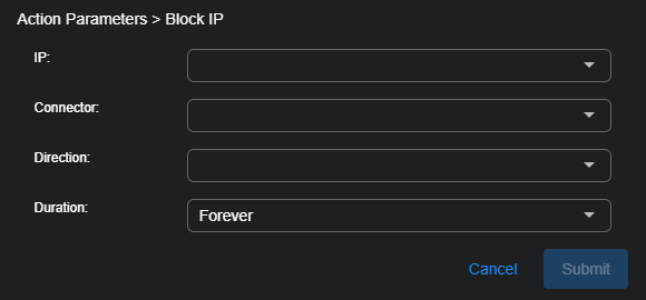 Stellar Cyber prepopulates the configuration wizards for case actions with the data corresponding to the case. For example, when configuring a Block IP action, the IP drop-down list automatically lists just those IP addresses associated with the case. You can always type in your own address, but the most relevant ones are already listed for you.