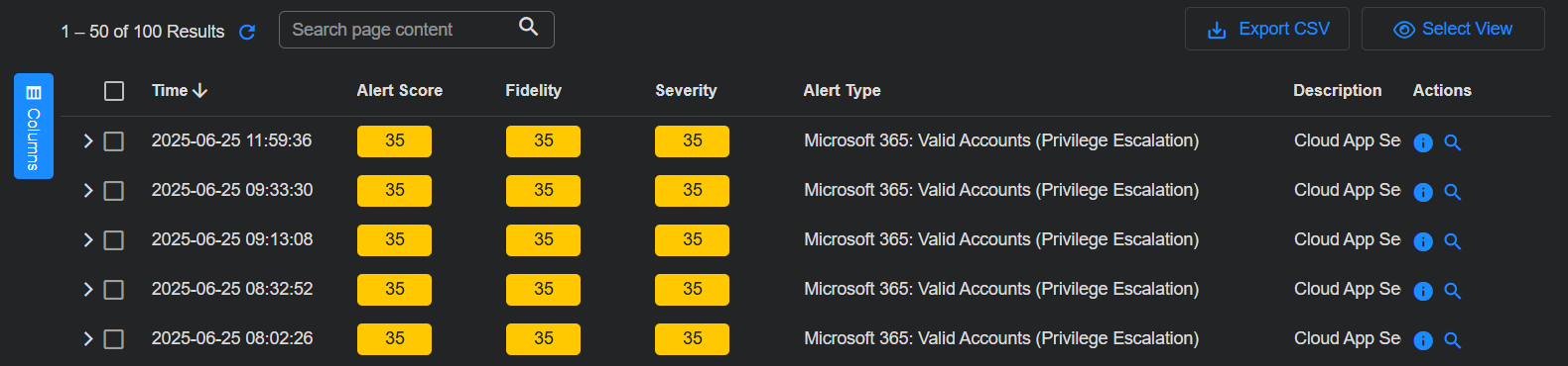 Each row provides an overview of each event. Select the check boxes to the left of each row to select records. You can also assign security-related events to Cases or create a new Case based on one or more alerts.