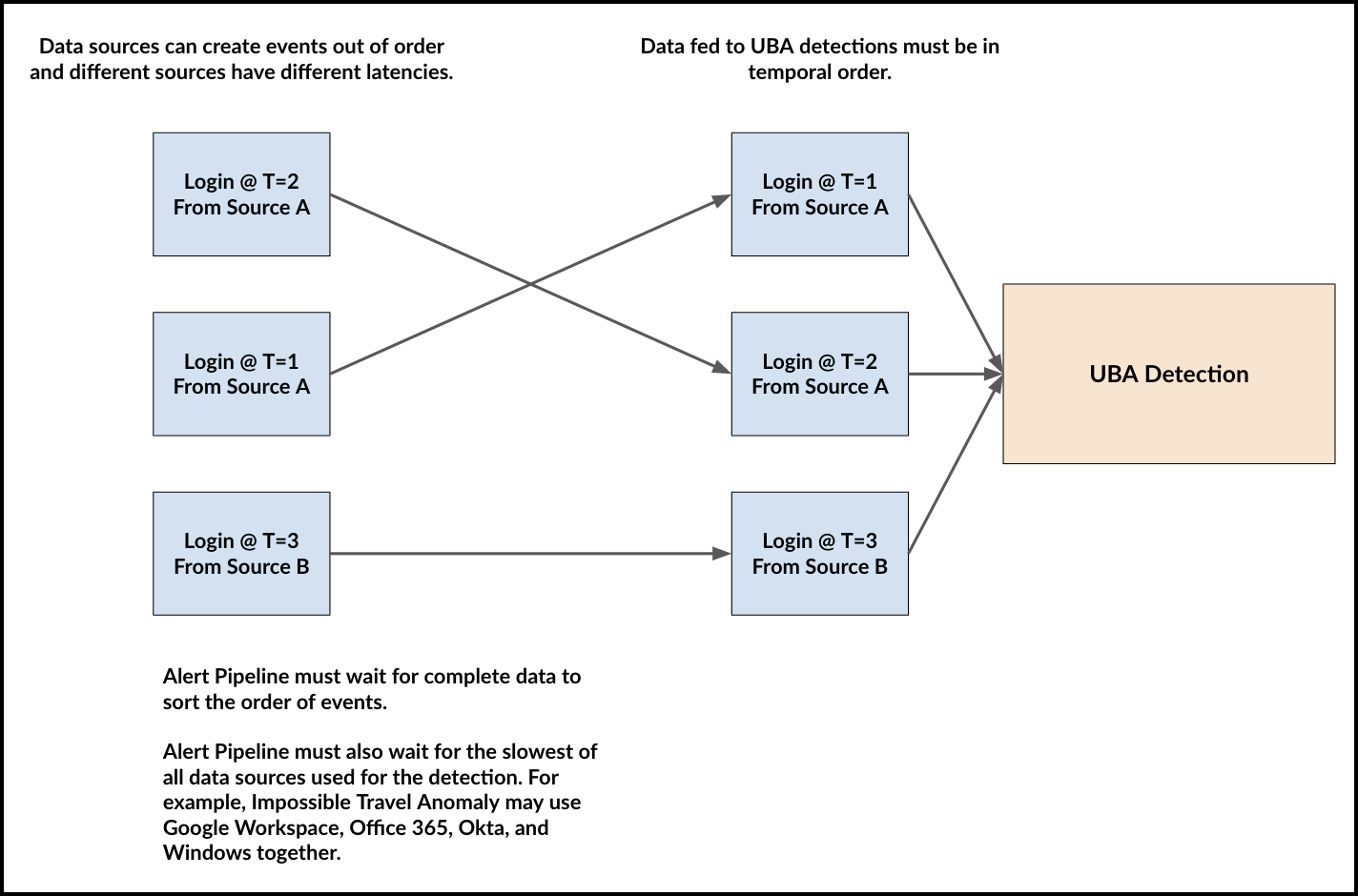 User Behavior Analysis (UBA) detections sometimes require temporal ordering of source records from heterogeneous sources (multiple different data sources). An example of such detection methodology is the Impossible Travel Anomaly.