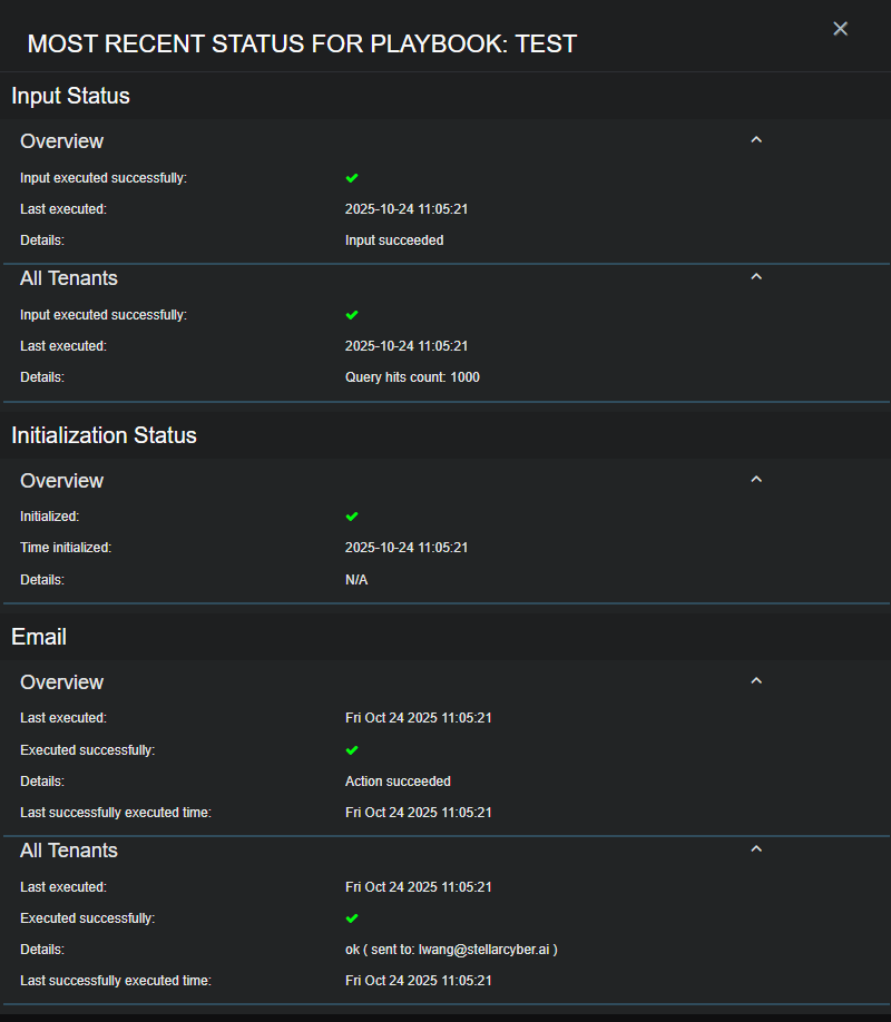 If the playbook runs on schedule but its condition is not met, the Action section does not update. In this case, it continues to display the results from the last time the playbook successfully triggered an action. For example, if the rule last triggered an alert yesterday but has since run several times without meeting its condition, the Last executed field in this section continues to show yesterday’s date. The Input Status section, however, updates each time the playbook runs.