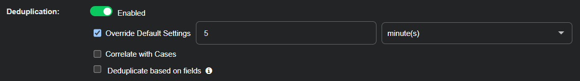 • Because of this, if both options are enabled, deduplication has no effect when the deduplication window is less than or equal to the Run Every window. This is because the Combine Result feature ensures that there is only a single alert document in each Run Every window.