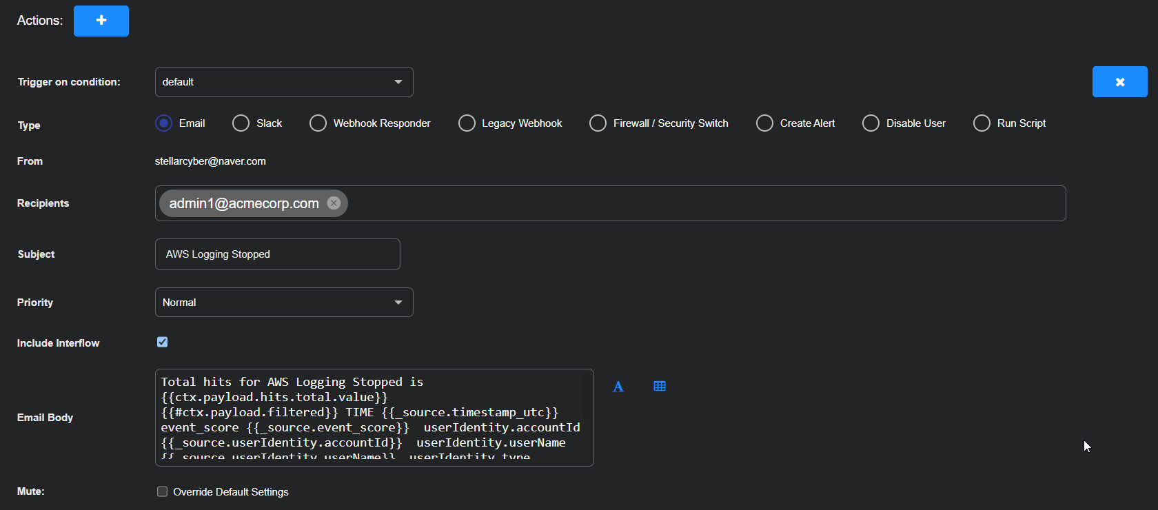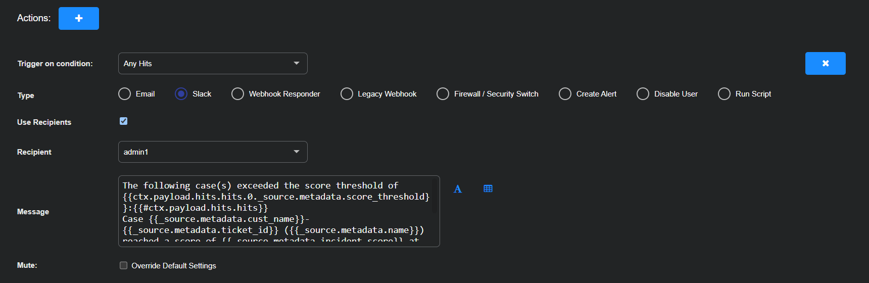 You can also mute individual actions associated with the playbook. Note that Alert-level mutes take precedence over Action-level mutes. If the alert is muted, no actions will be triggered. If the alert is unmuted, you can mute individual actions.